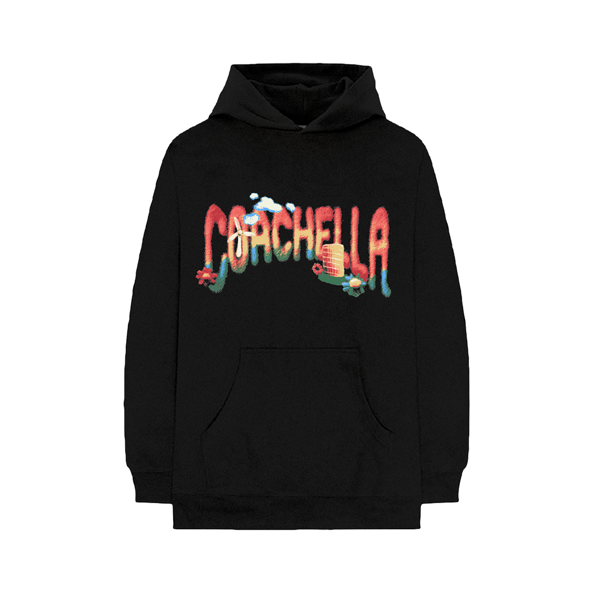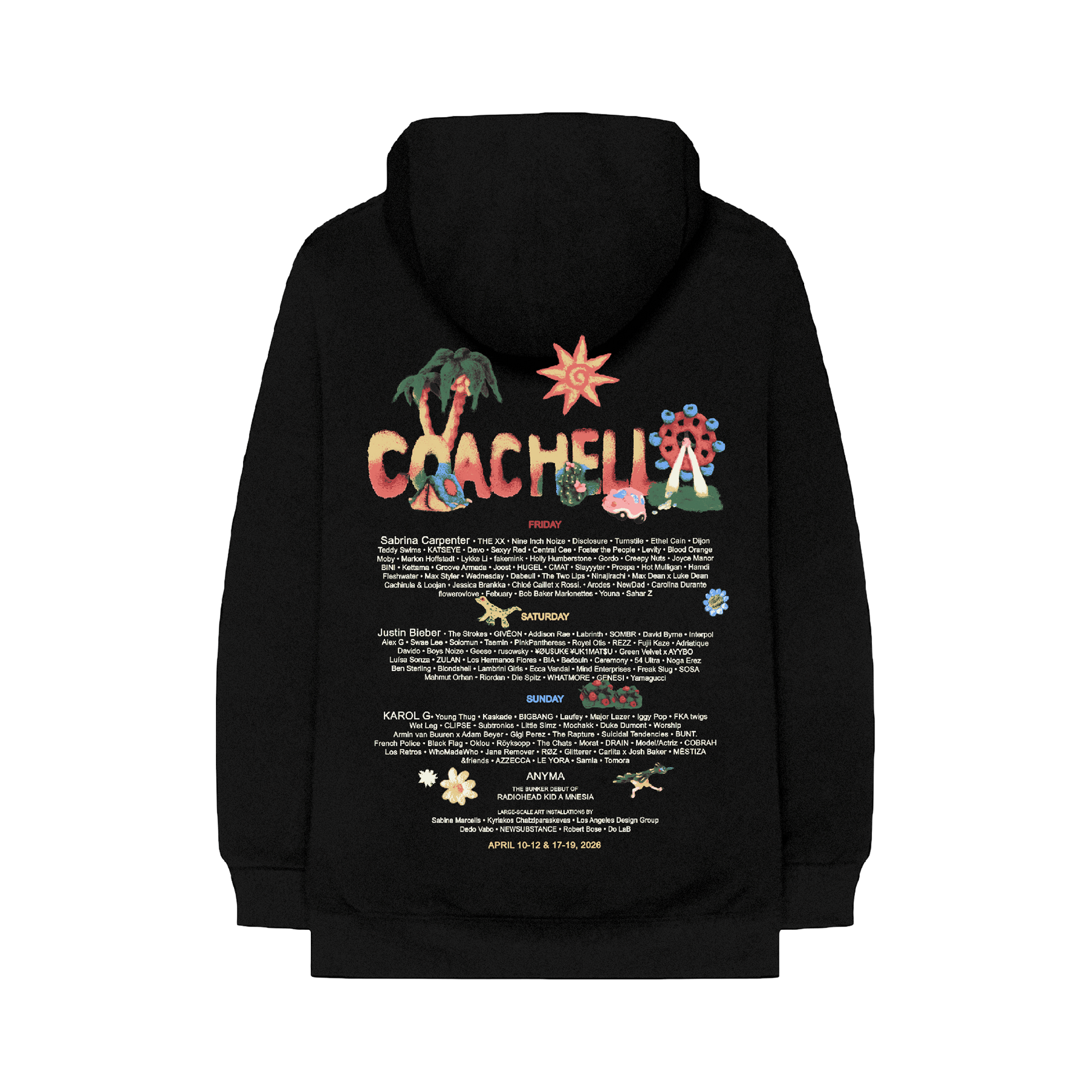 Heavyweight hoodie in black, featuring original felt-inspired logo art puff printed on the front and the 2026 Coachella lineup printed on the back. 60/40 cotton/polyester blend. Unisex, relaxed fit.