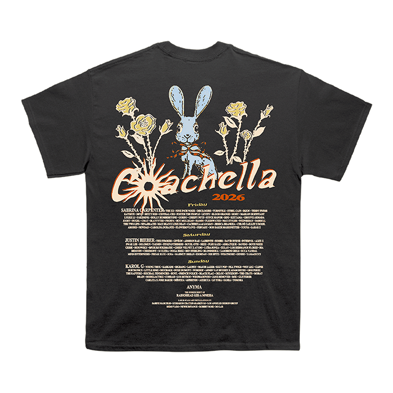 Heavyweight tee in vintage black, featuring Ribbons & Roses logo art printed on the front and the 2026 Coachella lineup printed on the back. 100% Pre-Shrunk Cotton. Unisex, relaxed fit.